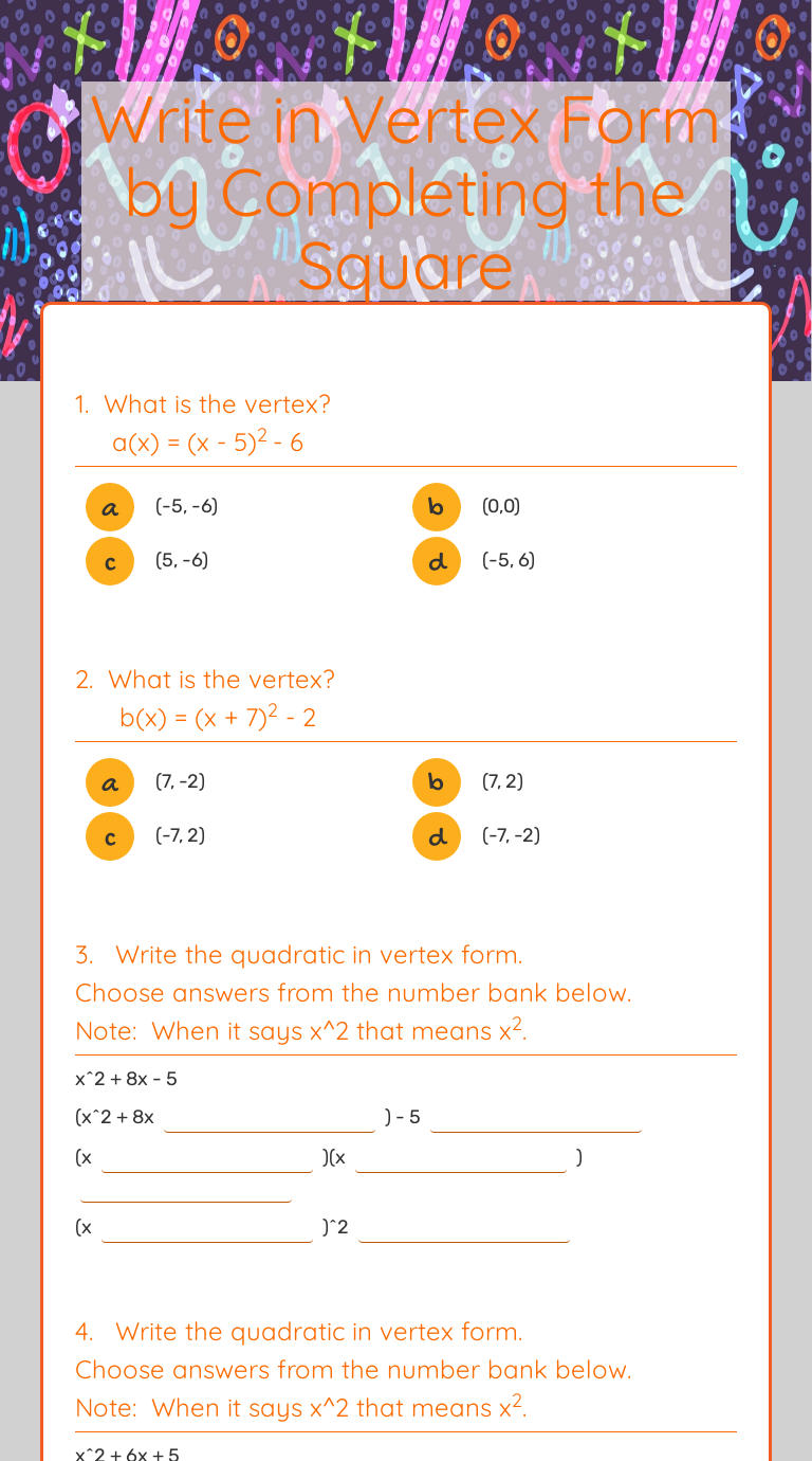 5.2 Vertex Form Worksheet Answers - Y 2 x 3 2 7 2. Web title alg2 5.2 vertex form blank notes author: Where a is a constant that tells us whether the parabola opens upwards or downwards, and (h, k) is the location of the. Web web these algebra 2 5.2 vertex form worksheet answers are entertaining and active, and they are often produced out or carried out on your computer system. Web web algebra ii 5.2 vertex form worksheet name ldentify the vertex of the quadratic function in standard form. 1 date_____ period____ ©d f2^0^1n9g [kuubtsa\ xswoef`tawgaorcex clclbcd.p r. The horizontal coordinate of the. Y = a ( x − h) 2 + k. If a is positive then the parabola. Other math questions and answers. 11) y = x2 − 12 x + 36 x y −8 −6 −4 −2 2 4 6 8 −8 −6 −4 −2 2 4 6 8 vertex: 1 date_____ period____ ©d f2^0^1n9g [kuubtsa\ xswoef`tawgaorcex clclbcd.p r. Y 2 x 3 2 7 2. Web the vertex form of a parabola's equation is generally expressed as: Web title alg2 5.2. 11) y = x2 − 12 x + 36 x y −8 −6 −4 −2 2 4 6 8 −8 −6 −4 −2 2 4 6 8 vertex: Y = a ( x − h) 2 + k. (h,k) is the vertex as you can see in the picture below. X− 5 2 2 − 41 4 21. Rewrite the. A guided problem solving worksheet is in your packet. X2 + 8 5 x+ 16 25 3. Web title alg2 5.2 vertex form blank notes author: 11) y = x2 − 12 x + 36 x y −8 −6 −4 −2 2 4 6 8 −8 −6 −4 −2 2 4 6 8 vertex: X− 1 2 2 + 31. Web these algebra 2 5.2 vertex form worksheet answers are entertaining and active, and they are often produced out or carried out on your computer system. 11) y = x2 − 12 x + 36 x y −8 −6 −4 −2 2 4 6 8 −8 −6 −4 −2 2 4 6 8 vertex: A guided problem solving worksheet is. X2 + 8 5 x+ 16 25 3. 1 date_____ period____ ©d f2^0^1n9g [kuubtsa\ xswoef`tawgaorcex clclbcd.p r. (h,k) is the vertex as you can see in the picture below. Y 2 x 3 2 7 2. Web identify the vertex and axis of symmetry of each by converting to vertex form. If a is positive then the parabola. Web web algebra ii 5.2 vertex form worksheet name ldentify the vertex of the quadratic function in standard form. 11) y = x2 − 12 x + 36 x y −8 −6 −4 −2 2 4 6 8 −8 −6 −4 −2 2 4 6 8 vertex: X− 5 2 2 − 41. X− 1 2 2 + 31 4 19. Web identify the vertex and axis of symmetry of each by converting to vertex form. Web the vertex form of a quadratic equation is. Other math questions and answers. X− 3 5 2 11. (h,k) is the vertex as you can see in the picture below. Y = a ( x − h) 2 + k. Other math questions and answers. If a is positive then the parabola. Rewrite the quadratic in standard form (vertex form). X− 3 5 2 11. (h,k) is the vertex as you can see in the picture below. X2 + 8 5 x+ 16 25 3. Web the vertex form of a quadratic equation is. Web web these algebra 2 5.2 vertex form worksheet answers are entertaining and active, and they are often produced out or carried out on your computer. The horizontal coordinate of the. 11) y = x2 − 12 x + 36 x y −8 −6 −4 −2 2 4 6 8 −8 −6 −4 −2 2 4 6 8 vertex: Where a is a constant that tells us whether the parabola opens upwards or downwards, and (h, k) is the location of the. Web web these algebra. Web web these algebra 2 5.2 vertex form worksheet answers are entertaining and active, and they are often produced out or carried out on your computer system. Web these algebra 2 5.2 vertex form worksheet answers are entertaining and active, and they are often produced out or carried out on your computer system. 11) y = x2 − 12 x + 36 x y −8 −6 −4 −2 2 4 6 8 −8 −6 −4 −2 2 4 6 8 vertex: If a is positive then the parabola. Rewrite the quadratic in standard form (vertex form). Given a quadratic equation in vertex form, find. Y = a ( x − h) 2 + k. Web identify the vertex and axis of symmetry of each by converting to vertex form. Where a is a constant that tells us whether the parabola opens upwards or downwards, and (h, k) is the location of the. Y 2 x 3 2 7 2. 1 date_____ period____ ©d f2^0^1n9g [kuubtsa\ xswoef`tawgaorcex clclbcd.p r. Other math questions and answers. Web web algebra ii 5.2 vertex form worksheet name ldentify the vertex of the quadratic function in standard form. X− 5 2 2 − 41 4 21. X− 3 5 2 11. The horizontal coordinate of the. Web the vertex form of a quadratic equation is. X− 1 2 2 + 31 4 19. A guided problem solving worksheet is in your packet. (h,k) is the vertex as you can see in the picture below. Web identify the vertex and axis of symmetry of each by converting to vertex form. 1 date_____ period____ ©d f2^0^1n9g [kuubtsa\ xswoef`tawgaorcex clclbcd.p r. (h,k) is the vertex as you can see in the picture below. X− 5 2 2 − 41 4 21. If a is positive then the parabola. Other math questions and answers. X− 3 5 2 11. Web the vertex form of a quadratic equation is. A guided problem solving worksheet is in your packet. X2 + 8 5 x+ 16 25 3. Y = a ( x − h) 2 + k. Web web algebra ii 5.2 vertex form worksheet name ldentify the vertex of the quadratic function in standard form. Web web these algebra 2 5.2 vertex form worksheet answers are entertaining and active, and they are often produced out or carried out on your computer system. Given a quadratic equation in vertex form, find. Web these algebra 2 5.2 vertex form worksheet answers are entertaining and active, and they are often produced out or carried out on your computer system. Rewrite the quadratic in standard form (vertex form).Write in Vertex Form by Completing the Square Interactive Worksheet