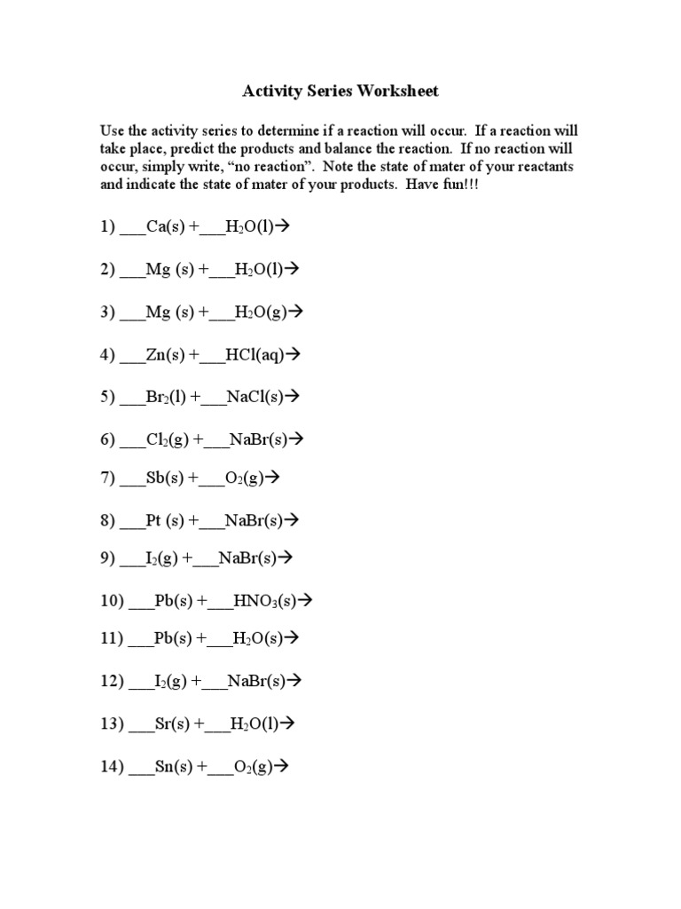 Activity Series Worksheet Answers