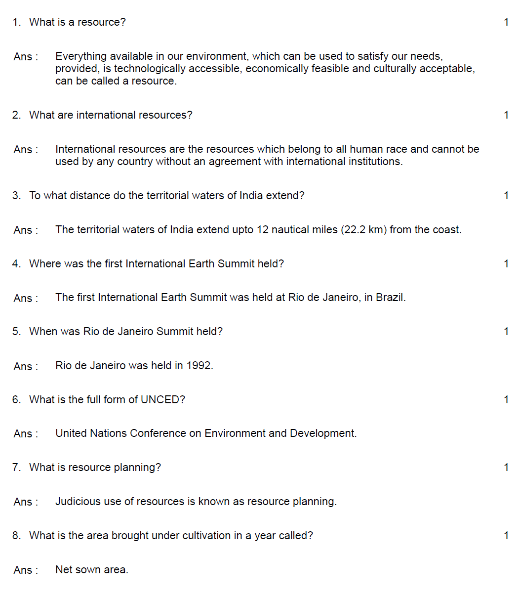 RESOURCES CH1 GEOGRAPHY QUESTION ANSWER CLASS 10