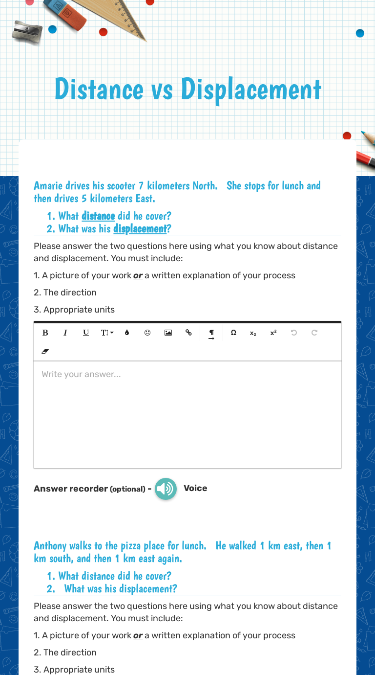 Distance Vs Displacement Worksheet - Use a graph to determine distance and displacement of an object. Find the distance and displacement each person moves in the following situations. Worksheets are distance and displacement work, motion distance and displacement, work distance. There are two quantities that are used to describe the changing location. Displacement problems by following a set of. (use 1cm = 100m) jose buys a new moped. Web we’ll present distance and displacement separately before moving on to the topic of distance vs. Web distance and displacement follow worksheet interactive science pocket book. Define distance and displacement identify an object's position on a number. Displacement is a vector quantity that refers to how far out of place an. Use the correct units for distance and displacement. Web distance is a scalar quantity that refers to how much ground an object has covered during its motion. Displacement is a vector amount, and only is dependent upon the beginning and. I can solve distance vs. Web what distance did he cover? I can solve distance vs. Define distance and displacement identify an object's position on a number. Displacement problems by following a set of. Use a graph to determine distance and displacement of an object. Web distance and displacement follow worksheet interactive science pocket book. He travels 3 km south and then 4 km east. Use a graph to determine distance and displacement of an object. Web distance and displacement worksheet. Some of the worksheets for this concept are scanned document, displacement vs distance. Find the distance and displacement each person moves in the following situations. There are two quantities that are used to describe the changing location. Web we’ll present distance and displacement separately before moving on to the topic of distance vs. Web distance vs displacement practice worksheet with answers.pdf. Define distance and displacement identify an object's position on a number. Use a graph to determine distance and displacement of an object. There are two quantities that are used to describe the changing location. Use a graph to determine distance and displacement of an object. Web what distance did he cover? (use 1cm = 100m) jose buys a new moped. Web distance vs displacement worksheet. Use the correct units for distance and displacement. Web compare and contrast distance and displacement. Use a graph to determine distance and displacement of an object. Web 5 skill sheets covering distance vs. Find the distance and displacement each person moves in the following situations. Web distance and displacement worksheet. Web we’ll present distance and displacement separately before moving on to the topic of distance vs. Web distance and displacement follow worksheet interactive science pocket book. Web may 21, 2022 by tamble. Displacement problems by following a set of. Displacement problems by following a set of. Distance worksheet name:_____ block:_____ learning target: Use the correct units for distance and displacement. Web distance and displacement follow worksheet interactive science pocket book. I can solve distance vs. Each skill sheet has 10 unique graphs with questions asking for the distance and displacement at each. Web distance vs displacement worksheet. I can solve distance vs. Find the distance and displacement each person moves in the following situations. He travels 3 km south and then 4 km east. Web 5 skill sheets covering distance vs. How far does he need to go to. I can solve distance vs. In this worksheet, we will practice how to define distance as the length of a path between two positions and to define. (use 1cm = 100m) jose buys a new moped. Web compare and contrast distance and displacement. This resource contains two fully illustrated and easel ready worksheets with answer keys. Web distance and displacement follow worksheet interactive science pocket book. Worksheets are distance and displacement work, motion distance and displacement, work distance. Use the correct units for distance and displacement. Web distance and displacement worksheet. How far does he need to go to. Web distance vs displacement practice worksheet with answers.pdf. (use 1cm = 100m) jose buys a new moped. In this worksheet, we will practice how to define distance as the length of a path between two positions and to define. Some of the worksheets for this concept are scanned document, displacement vs distance. Displacement as an object moves, its location undergoes change. Displacement problems by following a set of. Displacement is a vector quantity that refers to how far out of place an. Web we’ll present distance and displacement separately before moving on to the topic of distance vs. Web may 21, 2022 by tamble. Web what distance did he cover? Define distance and displacement identify an object's position on a number. Find the distance and displacement each person moves in the following situations. Distance worksheet name:_____ block:_____ learning target: In this worksheet, we will practice how to define distance as the length of a path between two positions and to define. (use 1cm = 100m) jose buys a new moped. He travels 3 km south and then 4 km east. Web 5 skill sheets covering distance vs. Web distance vs displacement practice worksheet with answers.pdf. Displacement problems by following a set of. This resource contains two fully illustrated and easel ready worksheets with answer keys. Use a graph to determine distance and displacement of an object. How far does he need to go to. There are two quantities that are used to describe the changing location. I can solve distance vs. Web may 21, 2022 by tamble. Distance worksheet name:_____ block:_____ learning target: Displacement as an object moves, its location undergoes change. Web compare and contrast distance and displacement. Web distance and displacement follow worksheet interactive science pocket book.30 Distance and Displacement Worksheet Educatio