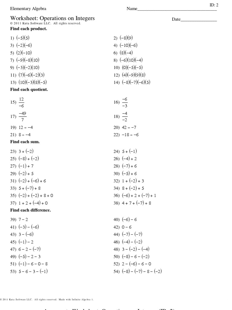 Elementary Algebra Worksheet Operations on Integers Group Theory