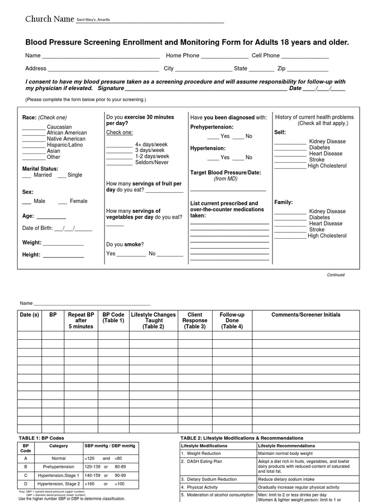 Blood Pressure Screening Form 0907 Hypertension Blood Pressure