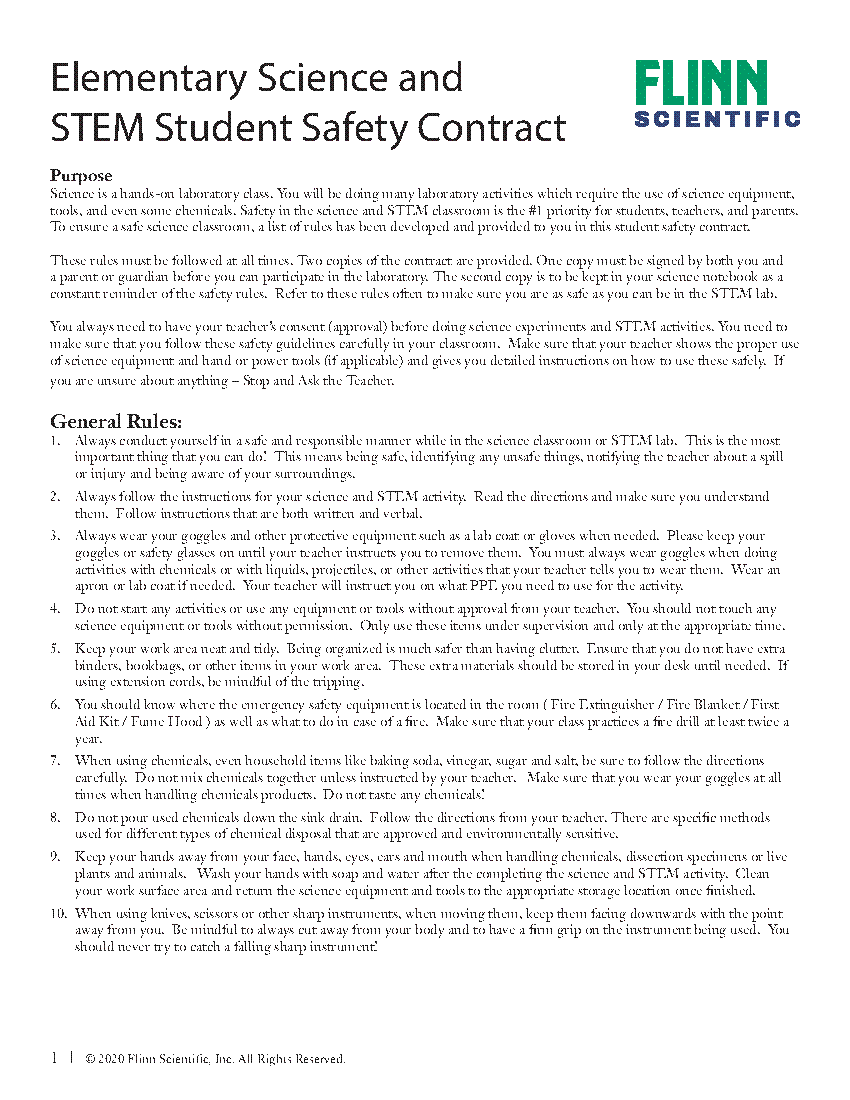 Flinn Scientific's Student Safety Contract