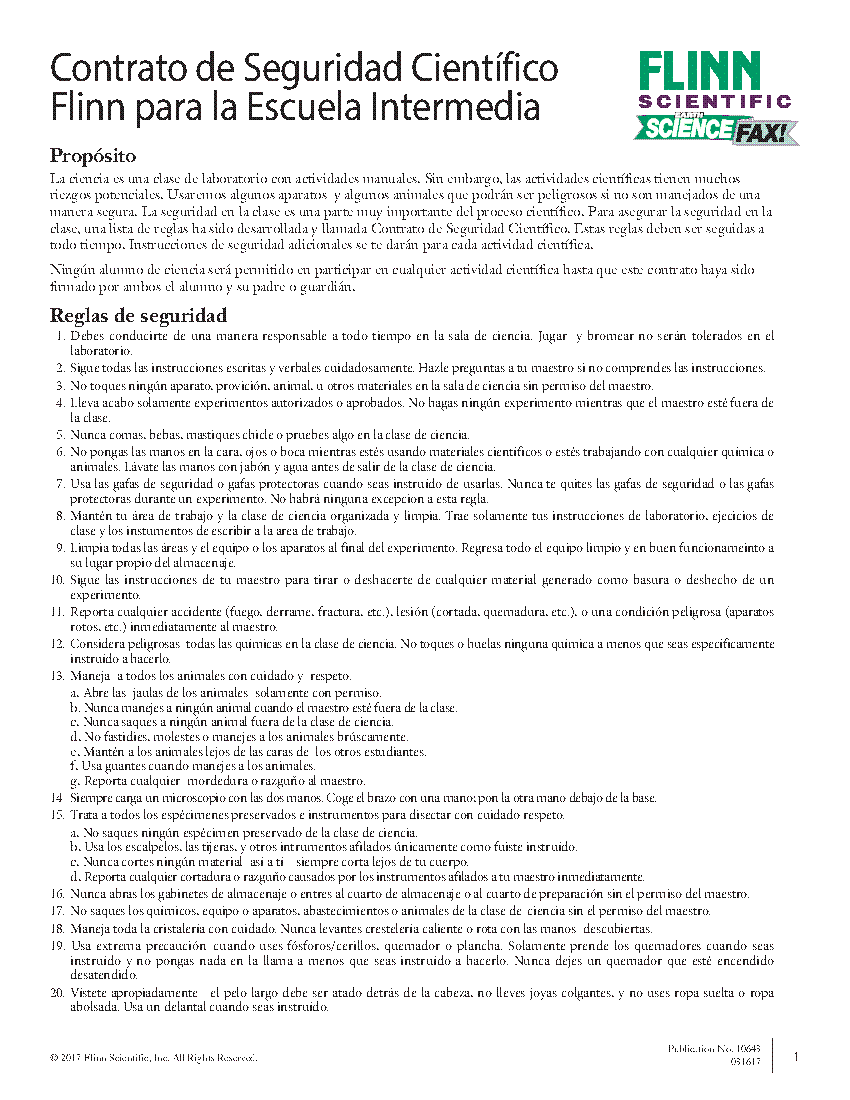 Middle School Science Safety Contract—Spanish Flinn Scientific