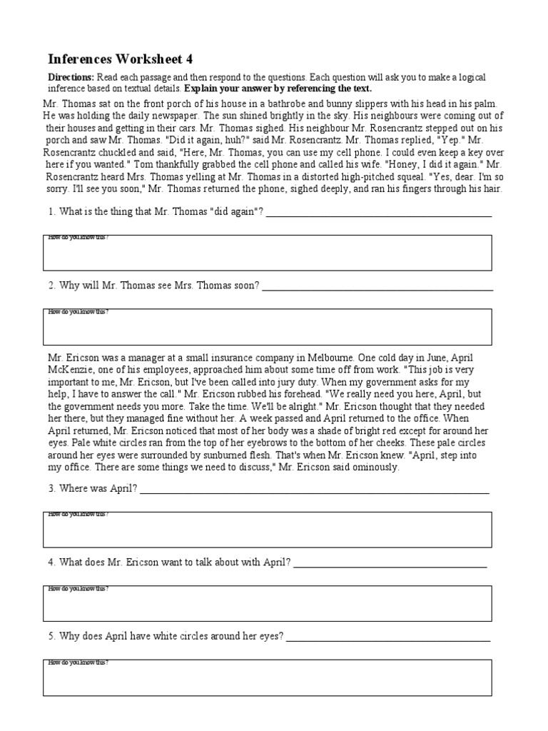 Inferences Worksheet 4 Answers - I know this because he is wearing a bathrobe and holding his newspaper. The author does not always include every detail, but you should be. 4th grade you make an inference when you use information in a text to draw a conclusion. This grade 5 and grade 6 resource is designed to give your students the opportunity to practice and. Thomas locked himself out of his house. Web here you will find 4 free pages containing social inferencing activities targeting older students and teens.these worksheets are part of a larger packet that contains a wider. Use these worksheets to help teach students about drawing inferences based on evidence in a reading passage. Go beyond what's explicitly stated and understand what's implied using our. 4th grade remember that you inference when you use details from a text to draw a conclusion that the author has not written down. Students make inferences to answer character questions from literary texts. Go beyond what's explicitly stated and understand what's implied using our. Use these worksheets to help teach students about drawing inferences based on evidence in a reading passage. Web grab some useful practice in inferring, or making an educated guess based on the given information. Web here you will find 4 free pages containing social inferencing activities targeting older students. Thomas locked himself out of his house. I know this because he is wearing a bathrobe and holding his newspaper. Students make inferences to answer character questions from literary texts. This grade 5 and grade 6 resource is designed to give your students the opportunity to practice and. Go beyond what's explicitly stated and understand what's implied using our. I know this because he is wearing a bathrobe and holding his newspaper. Use these worksheets to help teach students about drawing inferences based on evidence in a reading passage. Go beyond what's explicitly stated and understand what's implied using our. Web up to 24% cash back inferences worksheet 4 | answer key l. Thomas locked himself out of his. This grade 5 and grade 6 resource is designed to give your students the opportunity to practice and. This means that being able to make inferences by tapping into prior. I know this because he is wearing a bathrobe and holding his newspaper. The author does not always include every detail, but you should be. Thomas locked himself out of. I know this because he is wearing a bathrobe and holding his newspaper. This grade 5 and grade 6 resource is designed to give your students the opportunity to practice and. Web browse scholastic printable worksheets on making inferences or logical assumptions about what has been read as a result of hints and clues in the text. 4th grade you. Web here you will find 4 free pages containing social inferencing activities targeting older students and teens.these worksheets are part of a larger packet that contains a wider. The author does not always include every detail, but you should be. 4th grade you make an inference when you use information in a text to draw a conclusion. Thomas locked himself. Web browse scholastic printable worksheets on making inferences or logical assumptions about what has been read as a result of hints and clues in the text. The author does not always include every detail, but you should be. This grade 5 and grade 6 resource is designed to give your students the opportunity to practice and. I know this because. Web here you will find 4 free pages containing social inferencing activities targeting older students and teens.these worksheets are part of a larger packet that contains a wider. Web grab some useful practice in inferring, or making an educated guess based on the given information. Go beyond what's explicitly stated and understand what's implied using our. I know this because. 4th grade remember that you inference when you use details from a text to draw a conclusion that the author has not written down. The author does not always include every detail, but you should be. Web browse scholastic printable worksheets on making inferences or logical assumptions about what has been read as a result of hints and clues in. Web up to 24% cash back inferences worksheet 4 | answer key l. Web grab some useful practice in inferring, or making an educated guess based on the given information. 4th grade remember that you inference when you use details from a text to draw a conclusion that the author has not written down. This grade 5 and grade 6. The author does not always include every detail, but you should be. Go beyond what's explicitly stated and understand what's implied using our. This means that being able to make inferences by tapping into prior. 4th grade you make an inference when you use information in a text to draw a conclusion. Students make inferences to answer character questions from literary texts. Web browse scholastic printable worksheets on making inferences or logical assumptions about what has been read as a result of hints and clues in the text. I know this because he is wearing a bathrobe and holding his newspaper. This grade 5 and grade 6 resource is designed to give your students the opportunity to practice and. Use these worksheets to help teach students about drawing inferences based on evidence in a reading passage. Web grab some useful practice in inferring, or making an educated guess based on the given information. Web up to 24% cash back inferences worksheet 4 | answer key l. Web here you will find 4 free pages containing social inferencing activities targeting older students and teens.these worksheets are part of a larger packet that contains a wider. 4th grade remember that you inference when you use details from a text to draw a conclusion that the author has not written down. Thomas locked himself out of his house. Web browse scholastic printable worksheets on making inferences or logical assumptions about what has been read as a result of hints and clues 