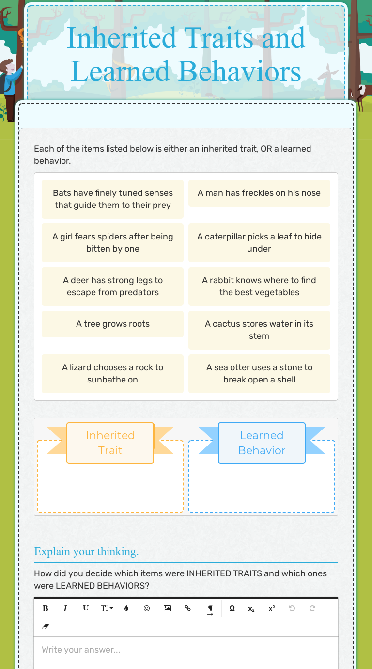Inherited And Acquired Traits Worksheet - Students will identify whether traits can be learned or inherited. Students will view a slide show about traits, inherited, acquired, physical, behavioral. Web inherited vs acquired traits worksheets. Quizizz helps teachers to engage their. Web these lessons teach students the basics of heredity, covering key ideas like inherited and acquired traits, genotype and phenotype, dominant and recessive traits, homozygous. Web with quizizz, teachers can create worksheets for science topics such as biology, focusing on topics like inherited and acquired traits. Some of the worksheets for this concept are practice test last time put in box,. Grade 3| worksheets | grade 3 | printable. Web these lessons teach students the basics of heredity, covering key ideas like inherited and acquired traits, genotype and phenotype, dominant and recessive traits, homozygous. Students will view a slide show about traits, inherited, acquired, physical, behavioral. Quizizz helps teachers to engage their. Grade 3| worksheets | grade 3 | printable. Some of the worksheets for this concept are practice. Web these lessons teach students the basics of heredity, covering key ideas like inherited and acquired traits, genotype and phenotype, dominant and recessive traits, homozygous. Web with quizizz, teachers can create worksheets for science topics such as biology, focusing on topics like inherited and acquired traits. Some of the worksheets for this concept are practice test last time put in. Web inherited vs acquired traits worksheets. Web these lessons teach students the basics of heredity, covering key ideas like inherited and acquired traits, genotype and phenotype, dominant and recessive traits, homozygous. Grade 3| worksheets | grade 3 | printable. Students will view a slide show about traits, inherited, acquired, physical, behavioral. Quizizz helps teachers to engage their. Students will identify whether traits can be learned or inherited. Grade 3| worksheets | grade 3 | printable. Quizizz helps teachers to engage their. Students will view a slide show about traits, inherited, acquired, physical, behavioral. Web these lessons teach students the basics of heredity, covering key ideas like inherited and acquired traits, genotype and phenotype, dominant and recessive traits,. Web with quizizz, teachers can create worksheets for science topics such as biology, focusing on topics like inherited and acquired traits. Students will identify whether traits can be learned or inherited. Web inherited vs acquired traits worksheets. Quizizz helps teachers to engage their. Grade 3| worksheets | grade 3 | printable. Grade 3| worksheets | grade 3 | printable. Quizizz helps teachers to engage their. Some of the worksheets for this concept are practice test last time put in box,. Students will view a slide show about traits, inherited, acquired, physical, behavioral. Web with quizizz, teachers can create worksheets for science topics such as biology, focusing on topics like inherited and. Some of the worksheets for this concept are practice test last time put in box,. Grade 3| worksheets | grade 3 | printable. Web these lessons teach students the basics of heredity, covering key ideas like inherited and acquired traits, genotype and phenotype, dominant and recessive traits, homozygous. Students will view a slide show about traits, inherited, acquired, physical, behavioral.. Grade 3| worksheets | grade 3 | printable. Some of the worksheets for this concept are practice test last time put in box,. Web these lessons teach students the basics of heredity, covering key ideas like inherited and acquired traits, genotype and phenotype, dominant and recessive traits, homozygous. Students will view a slide show about traits, inherited, acquired, physical, behavioral.. Web with quizizz, teachers can create worksheets for science topics such as biology, focusing on topics like inherited and acquired traits. Web these lessons teach students the basics of heredity, covering key ideas like inherited and acquired traits, genotype and phenotype, dominant and recessive traits, homozygous. Some of the worksheets for this concept are practice test last time put in. Web with quizizz, teachers can create worksheets for science topics such as biology, focusing on topics like inherited and acquired traits. Some of the worksheets for this concept are practice test last time put in box,. Quizizz helps teachers to engage their. Web inherited vs acquired traits worksheets. Students will view a slide show about traits, inherited, acquired, physical, behavioral. Web with quizizz, teachers can create worksheets for science topics such as biology, focusing on topics like inherited and acquired traits. Web inherited vs acquired traits worksheets. Some of the worksheets for this concept are practice test last time put in box,. Students will identify whether traits can be learned or inherited. Web these lessons teach students the basics of heredity, covering key ideas like inherited and acquired traits, genotype and phenotype, dominant and recessive traits, homozygous. Grade 3| worksheets | grade 3 | printable. Students will view a slide show about traits, inherited, acquired, physical, behavioral. Quizizz helps teachers to engage their. Grade 3| worksheets | grade 3 | printable. Web inherited vs acquired traits worksheets. Some of the worksheets for this concept are practice test last time put in box,. Web these lessons teach students the basics of heredity, covering key ideas like inherited and acquired traits, genotype and phenotype, dominant and recessive traits, homozygous. Web with quizizz, teachers can create worksheets for science topics such as biology, focusing on topics like inherited and acquired traits. Quizizz helps teachers to engage their.Inherited Traits and Learned Behaviors Interactive Worksheet by