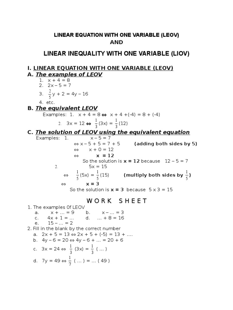 Linear Equations With One Variable Worksheet