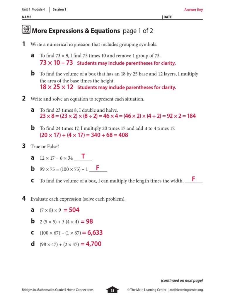 bridges in mathematics grade 5 home connections answer key pgs 1518
