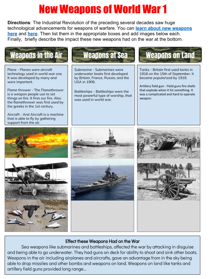 New Weapons And Technology Of Ww1 Worksheet Answers