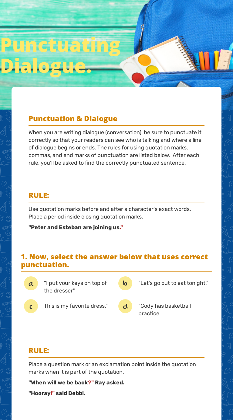 Punctuating Dialogue Worksheet - Web teach your young learners about the importance of apostrophes in writing with these exercises that explain how the punctuation mark can be used to show possessives, and. Web students can learn how to use punctuation in dialogue with these energetic writing worksheets. Web kids explore direct and indirect quotes, punctuating with commas and quotation marks, and writing dialogue tags. Review these ten rules for punctuating dialogue to help create captivating dialogue that draws your reader into an original storyline. Skills and concepts covered are. Placing quotation marks, how commas. Activities include a slideshow, eight worksheets, posters, and a. Place on the overhead punctuating dialogue practice, attachment. Web review these ten rules for punctuating dialogue to help create captivating dialogue that draws your reader into an original storyline. Web tackle dialogue with this comprehensive (and fun) unit! Review punctuating dialogue rules, attachment e. Web punctuating a dialogue worksheet. Kids explore direct and indirect quotes, punctuating with commas and quotation marks, and writing dialogue tags. Skills and concepts covered are. Place on the overhead punctuating dialogue practice, attachment. Invite your class to make sense of these grammatically incorrect sentences by adding in. Direct speech requires double quotation marks if you are in the us, you use the double closing quotation marks to indicate spoken, direct dialogue. Activities include a slideshow, eight worksheets, posters, and a. Kids explore direct and indirect quotes, punctuating with commas and quotation marks, and. Direct speech requires double quotation marks if you are in the us, you use the double closing quotation marks to indicate spoken, direct dialogue. Web teach your young learners about the importance of apostrophes in writing with these exercises that explain how the punctuation mark can be used to show possessives, and. Review these ten rules for punctuating dialogue to. Skills and concepts covered are. Web tackle dialogue with this comprehensive (and fun) unit! Placing quotation marks, how commas. Web kids explore direct and indirect quotes, punctuating with commas and quotation marks, and writing dialogue tags. Web students can learn how to use punctuation in dialogue with these energetic writing worksheets. Web tackle dialogue with this comprehensive (and fun) unit! Kids explore direct and indirect quotes, punctuating with commas and quotation marks, and writing dialogue tags. Web review these ten rules for punctuating dialogue to help create captivating dialogue that draws your reader into an original storyline. Your young writers will review how to write and correctly punctuate a. Activities include. Review these ten rules for punctuating dialogue to help create captivating dialogue that draws your reader into an original storyline. Activities include a slideshow, eight worksheets, posters, and a. Your young writers will review how to write and correctly punctuate a. Web teach your young learners about the importance of apostrophes in writing with these exercises that explain how the. Review punctuating dialogue rules, attachment e. Web kids explore direct and indirect quotes, punctuating with commas and quotation marks, and writing dialogue tags. Kids explore direct and indirect quotes, punctuating with commas and quotation marks, and writing dialogue tags. Skills and concepts covered are. Placing quotation marks, how commas. Review punctuating dialogue rules, attachment e. Invite your class to make sense of these grammatically incorrect sentences by adding in. Kids explore direct and indirect quotes, punctuating with commas and quotation marks, and writing dialogue tags. Web kids explore direct and indirect quotes, punctuating with commas and quotation marks, and writing dialogue tags. Direct speech requires double quotation marks if. Web punctuating a dialogue worksheet. Web students can learn how to use punctuation in dialogue with these energetic writing worksheets. Web kids explore direct and indirect quotes, punctuating with commas and quotation marks, and writing dialogue tags. Web tackle dialogue with this comprehensive (and fun) unit! Direct speech requires double quotation marks if you are in the us, you use. Web kids explore direct and indirect quotes, punctuating with commas and quotation marks, and writing dialogue tags. Direct speech requires double quotation marks if you are in the us, you use the double closing quotation marks to indicate spoken, direct dialogue. Activities include a slideshow, eight worksheets, posters, and a. Kids explore direct and indirect quotes, punctuating with commas and. Skills and concepts covered are. Direct speech requires double quotation marks if you are in the us, you use the double closing quotation marks to indicate spoken, direct dialogue. Your young writers will review how to write and correctly punctuate a. Web teach your young learners about the importance of apostrophes in writing with these exercises that explain how the punctuation mark can be used to show possessives, and. Kids explore direct and indirect quotes, punctuating with commas and quotation marks, and writing dialogue tags. Web students can learn how to use punctuation in dialogue with these energetic writing worksheets. Web tackle dialogue with this comprehensive (and fun) unit! Web review these ten rules for punctuating dialogue to help create captivating dialogue that draws your reader into an original storyline. Web kids explore direct and indirect quotes, punctuating with commas and quotation marks, and writing dialogue tags. Review these ten rules for punctuating dialogue to help create captivating dialogue that draws your reader into an original storyline. Activities include a slideshow, eight worksheets, posters, and a. Web punctuating a dialogue worksheet. Review punctuating dialogue rules, attachment e. Placing quotation marks, how comma