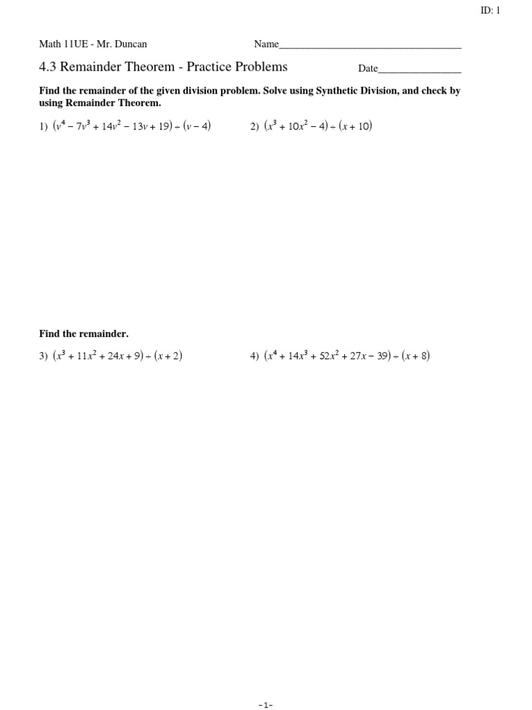 Remainder Theorem Worksheet A Comprehensive Guide For Students Free