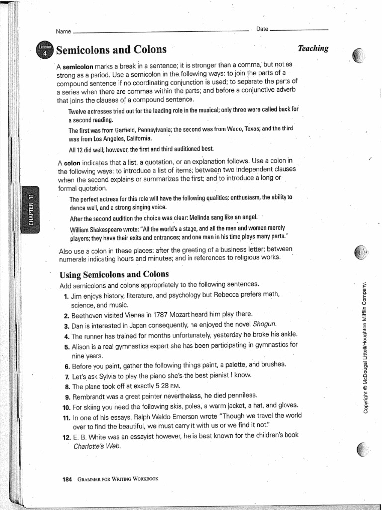 Semicolon Practice Worksheet - Web the commas, colons, and semicolons lesson plan includes three worksheets: Use a colon to link a main clause with an appositive.an appositive is a noun or noun. An activity worksheet, a practice worksheet, and a homework assignment. This combination quiz and worksheet will test your knowledge of these. Web writing center semicolons and colons last edited: Web about this quiz & worksheet. Then, students practice using semicolons with three progressively more. Click to download a pdf of the answer key. You can refer to the. There are proper ways to use semicolons and colons in sentences. Web semicolon use worksheet # 2 put in the appropriate semicolons:. Learn more about how to use them here! In the text boxes, rewrite each sentence to. This combination quiz and worksheet will test your knowledge of these. Multiple choice select the sentence that has correctly been punctuated: Web the commas, colons, and semicolons lesson plan includes three worksheets: Students will practice using semicolons and colons while also learning. Multiple choice select the sentence that has correctly been punctuated: Colons a basic overview a colon can be used to to introduce a list, a quotation,. Web writing center semicolons and colons last edited: Colons a basic overview a colon can be used to to introduce a list, a quotation,. Web about this quiz & worksheet. Web semi colon with a period and still have two complete sentences. Web writing center semicolons and colons last edited: An activity worksheet, a practice worksheet, and a homework assignment. The semicolon functions more like a period. Web free, printable semicolon worksheets to develop strong grammar, language and writing skills. Click to download a pdf of these practice activities. An activity worksheet, a practice worksheet, and a homework assignment. Web make practicing grammar more fun with these basketball themed semicolon and colon worksheets. Web answers to the colons worksheet. This combination quiz and worksheet will test your knowledge of these. In the text boxes, rewrite each sentence to. There are proper ways to use semicolons and colons in sentences. Put in the necessary punctuation. Web about this quiz & worksheet. An activity worksheet, a practice worksheet, and a homework assignment. I believe there are 3 things. Exercising helps to keep you healthy and fit proper nutrition is also important. Web writing center semicolons and colons last edited: Colons a basic overview a colon can be used to to introduce a list, a quotation,. Each of the following sentences needs either a comma or a semicolon. An activity worksheet, a practice worksheet, and a homework assignment. Learn more about how to use them here! Web colons and semicolons are two valuable pieces of punctuation that separate sentence elements. It is important for students to know that the semicolon does not function in the same way as the comma. Web semicolon use worksheet # 2 put in the appropriate semicolons:. There are proper ways to use semicolons and colons in sentences. Each of the following sentences needs either a comma or a semicolon. Web as a general rule, you. Explanations and examples of the three primary semicolons usages. Learn more about how to use them here! Web free, printable semicolon worksheets to develop strong grammar, language and writing skills. An activity worksheet, a practice worksheet, and a homework assignment. Multiple choice select the sentence that has correctly been punctuated: An activity worksheet, a practice worksheet, and a homework assignment. Use a colon to link a main clause with an appositive.an appositive is a noun or noun. In the text boxes, rewrite each sentence to. Avoid using two semicolons to connect three sentences. Colons a basic overview a colon can be used to to introduce a list, a quotation,. Then, students practice using semicolons with three progressively more. The semicolon functions more like a period. It is important for students to know that the semicolon does not function in the same way as the comma. Web semicolons knowing when to use semicolons is easier if you follow a few simple rules. Web free, printable semicolon worksheets to develop strong grammar, language and writing skills. Learn more about how to use them here! Web the commas, colons, and semicolons lesson plan includes three worksheets: I believe there are 3 things. Each of the following sentences needs either a comma or a semicolon. Web about this quiz & worksheet. Web semi colon with a period and still have two complete sentences. Web answers to the colons worksheet. More than 1,500 ela activities. Use a colon to link a main clause with an appositive.an appositive is a noun or noun. An activity worksheet, a practice worksheet, and a homework assignment. Use a semicolon to join two related complete thoughts (sentences/independent. Web writing center semicolons and colons last edited: Multiple choice select the sentence that has correctly been punctuated: There are proper ways to use semicolons and colons in sentences. Web semicolon use worksheet # 2 put in the appropriate semicolons:. Each of the following sentences needs either a comma or a semicolon. Avoid using two semicolons to connect three sentences. Use a colon to link a main clause with an appositive.an appositive is a noun or noun. Multiple choice select the sentence that has correctly been punctuated: Colons a basic overview a colon can be used to to introduce a list, a quotation,. Web semicolon worksheet name _____ date _____ directions: Web colons and semicolons are two valuable pieces of punctuation that separate sentence elements from each other. More than 1,500 ela activities. The semicolon functions more like a period. In the text boxes, rewrite each sentence to. Web writing center semicolons and colons last edited: Exercising helps to keep you healthy and fit proper nutrition is also important. Web semicolon use worksheet # 2 put in the appropriate semicolon