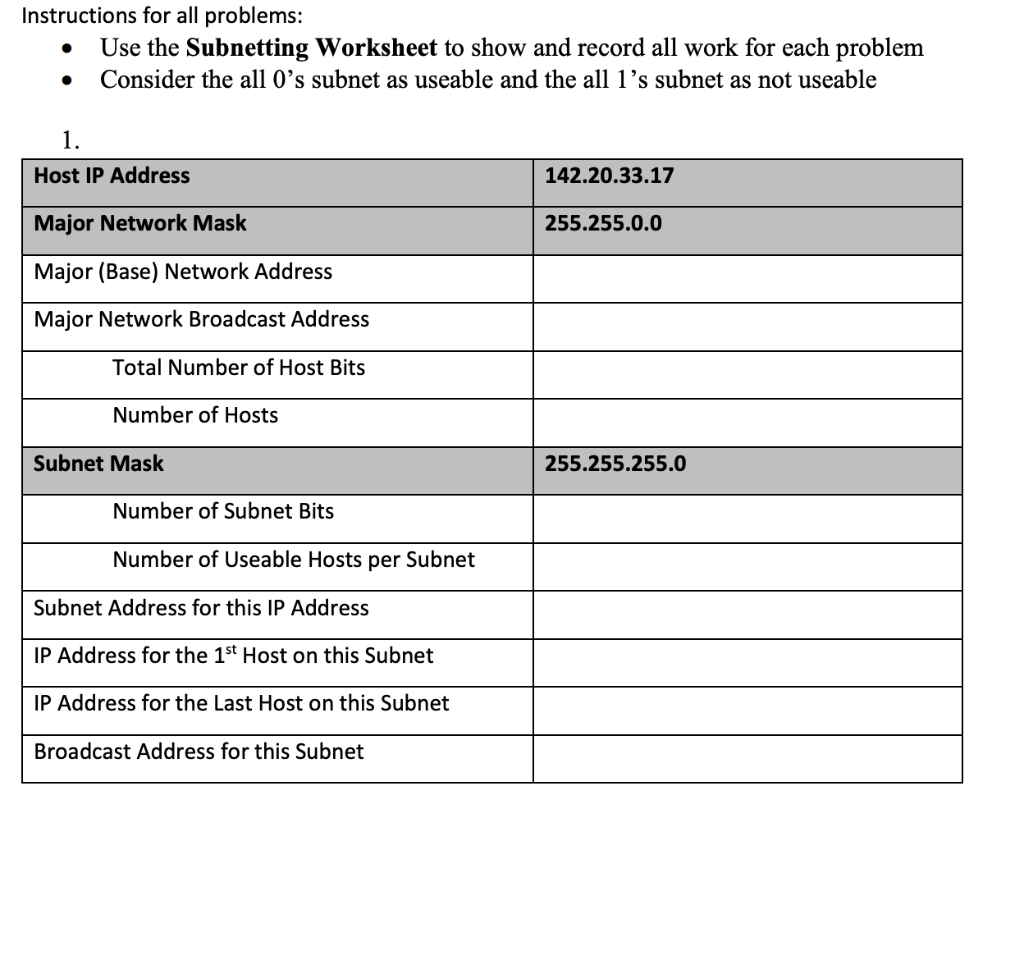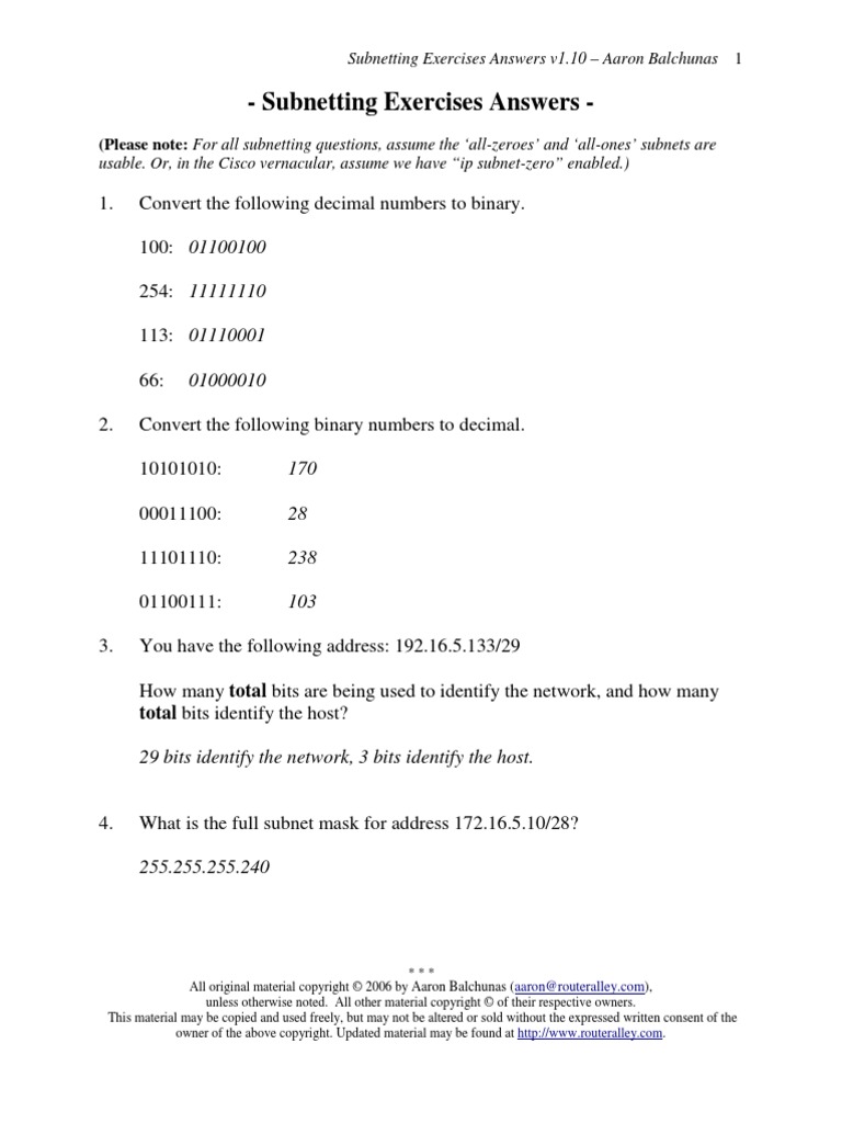 Subnetting Practice Worksheets - Web these basic exercises walk your through the structure of an ipv4 address and subnetmasks. Here are some useful subnetting questions to practice and improve your subnetting skills specifically designed for anyone who wants. You can verify your answers with our subnet calculator or vlsm calculator. Practice with classful and classless ip addresses, calculate the network. Web we provide text based and image based subnetting questions which simulate the real world. Yes it is possible, using subnet mask 255.255.255.248. Without this sheet, you have to use subnetting calculator to determine. Web if you need help, take a look at our how to subnet guide. Web outside of class practice class c subnetting in your head (determine the subnet, etc. Web below are the practice questions based on different subnetting classes. There are eleven different question types and millions of. Anding with the default subnet mask allows your computer to figure out the network portion of the address. Web may 4, 2023. Web you can check the network and host values and you can deteremine that which subnet is useful for you. Web to learn how to subnet: Web in video 1, you will learn the basics of subnetting. Web may 4, 2023. Here are some useful subnetting questions to practice and improve your subnetting skills specifically designed for anyone who wants. Web to learn how to subnet: Web you can check the network and host values and you can deteremine that which subnet is useful for you. You can verify your answers with our subnet calculator or vlsm calculator. 1 1 0 0 0 0 0 0. Watch the free training videos listed beneath the problem generator. Web this template can help you practice questions related to: Web the subnet mask in binary. You can verify your answers with our subnet calculator or vlsm calculator. Web about this quiz & worksheet. Web below are the practice questions based on different subnetting classes. Web these basic exercises walk your through the structure of an ipv4 address and subnetmasks. Is this possible, and what subnet mask should you use? Every subnetting problem will ask you to solve for one or more of seven possible attributes. You can verify your answers with our subnet calculator or vlsm calculator. 1 1 0 0 0 0 0 0. Is this possible, and what subnet mask should you use? Web the subnet mask in binary. 30 subnet mask or /30 subnet march 30, 2023. The best way to learn how to subnet and increase your speed is practice, practice, practice! Assign ip address to switch, router and pc in packet tracer. Web if you need help, take a look at our how to subnet guide. Among other details, you should know what's limited by. Every subnetting problem will ask you to solve for one or more of seven possible attributes. 0 1 1 0 0 1 0 0. You can verify your answers with our subnet calculator or vlsm calculator. Web may 4, 2023. 0 0 0 0 1 0. Yes it is possible, using subnet mask 255.255.255.248. There are eleven different question types and millions of. 172.16 subnet march 26, 2023. I have especially designed these questions to help prepare for subnetting in the best possible way. Web the host portion and apply this to the number of hosts per subnet formula if five bits are in the host. Web the host portion and apply this to the number of hosts per subnet formula if five bits are in the host portion of the address this would be 2 or 2 x 2 x 2 x 2 x 2 = 32 hosts. I have especially designed these questions to help prepare for subnetting in the best possible way. Web. Web to learn how to subnet: There are eleven different question types and millions of. Web practice classful subnetting dec 205.102.250.10 ===== => 255.255.255.248 =====> => subnet of ipa in binary (anding) => ==> answer the questions based on. You still are using the default mask for. Web these basic exercises walk your through the structure of an ipv4 address. Assign ip address to switch, router and pc in packet tracer. Web in video 1, you will learn the basics of subnetting. Practice with classful and classless ip addresses, calculate the network. Watch the free training videos listed beneath the problem generator. 0 0 0 0 1 0. Every subnetting problem will ask you to solve for one or more of seven possible attributes. Anding with the default subnet mask allows your computer to figure out the network portion of the address. The best way to learn how to subnet and increase your speed is practice, practice, practice! 0 1 1 0 0 1 0 0. Click on the [new problem] button below. Web may 4, 2023. Web you can check the network and host values and you can deteremine that which subnet is useful for you. Web to learn how to subnet: Web outside of class practice class c subnetting in your head (determine the subnet, etc. Web this template can help you practice questions related to: 172.16 subnet march 26, 2023. I have especially designed these questions to help prepare for subnetting in the best possible way. Here are some useful subnetting questions to practice and improve your subnetting skills specifically designed for anyone who wants. Web about this quiz & worksheet. 30 subnet mask or /30 subnet march 30, 2023. Web outside of class practice class c subnetting in your head (determine the subnet, etc. Without this sheet, you have to use subnetting calculator to determine. Yes it is possible, using subnet mask 255.255.255.248. Web in video 1, you will learn the basics of subnetting. Here are some useful subnetting questions to practice and improve your subnetting skills specifically designed for anyone who wants. Web to learn how to subnet: I have especially designed these questions to help prepare for subnetting in the best possible way. 0 1 1 0 0 1 0 0. 172.16 subnet march 26, 2023. Web may 4, 2023. Web about this quiz & worksheet. 30 subnet mask or /30 subnet march 30, 2023. You can verify your answers with our subnet calculator or vlsm calculator. Web this template can help you practice questions related to: Web these 
