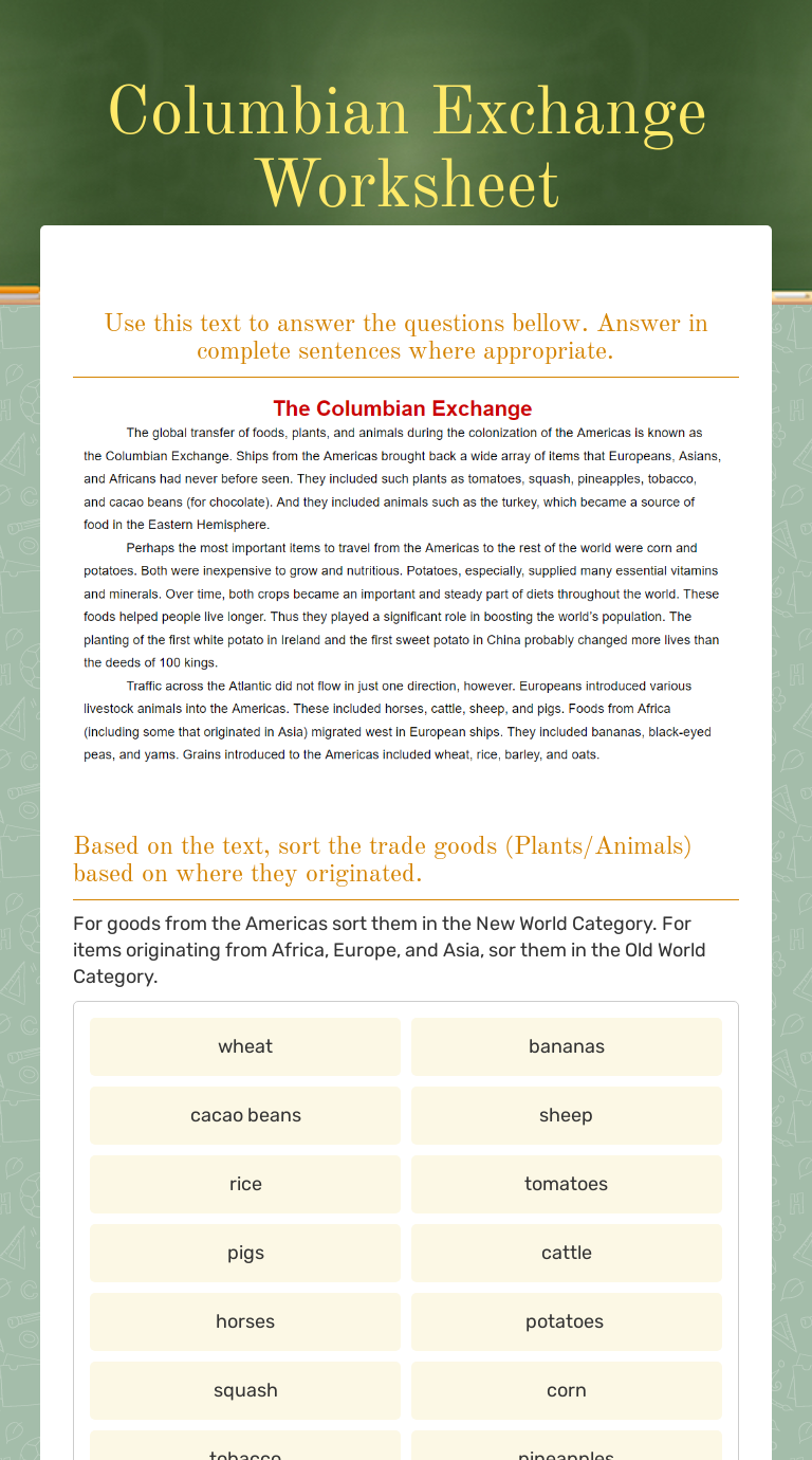 Columbian Exchange Worksheet Interactive Worksheet by Mr. Foy Wizer.me