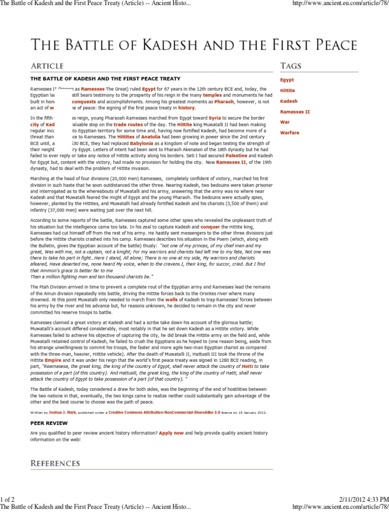Web Although It Is Often Referred To As The Treaty Of Kadesh, It Was Actually Signed Long After The Battle, And Kadesh Is Not Mentioned In The Text.