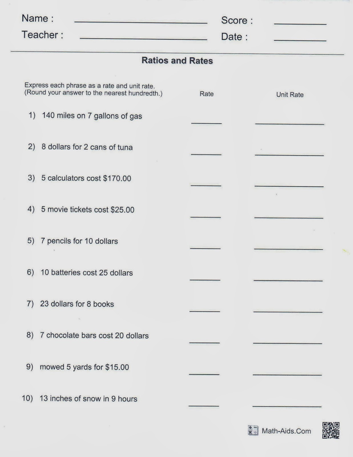Unit Rate Worksheet 6Th Grade